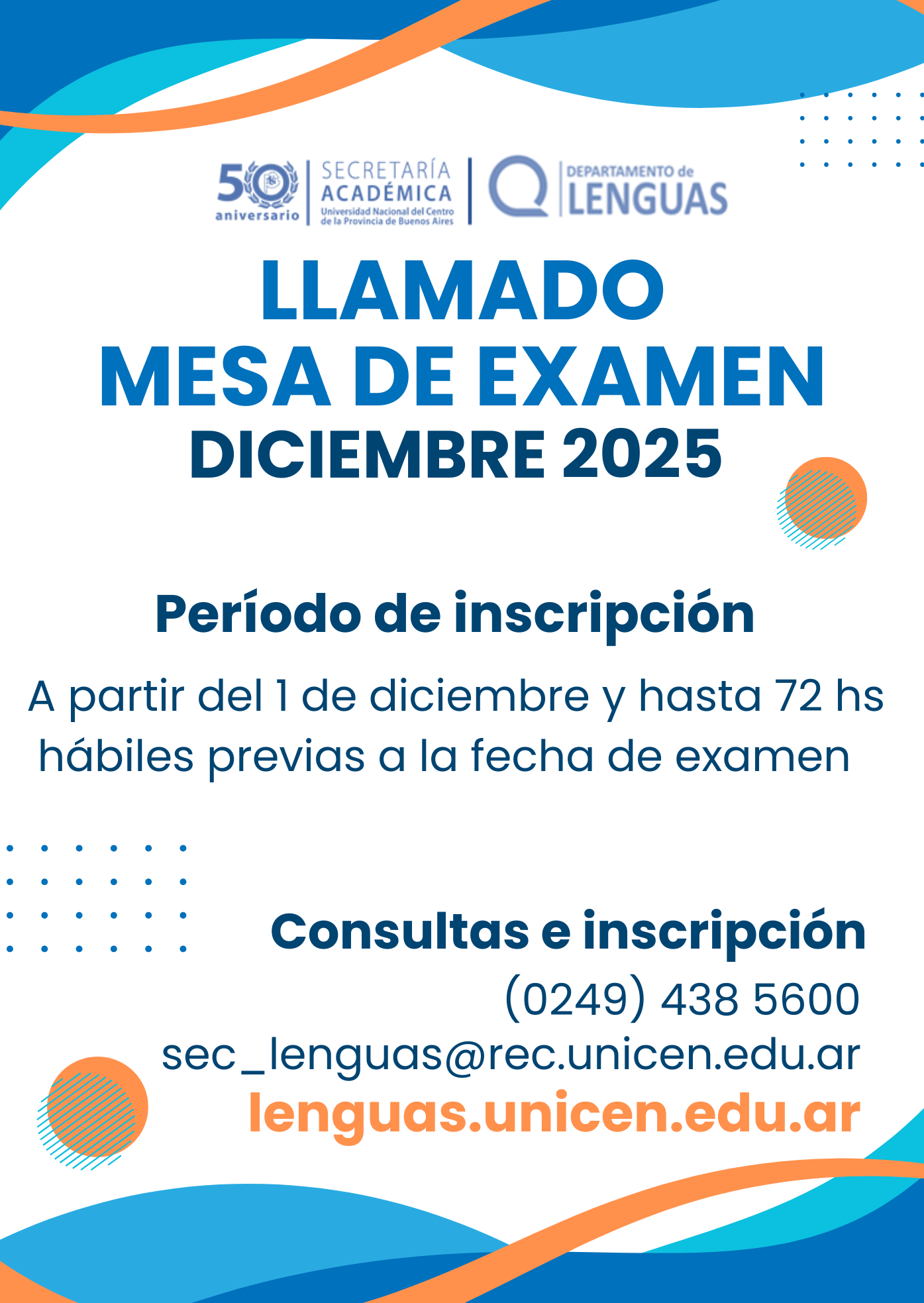 El Departamento de Lenguas dependiente de la Secretaría Académica de la UNCPBA, informa que se encuentran disponibles las fechas de examen final correspondientes al llamado de diciembre de 2025. Cabe…